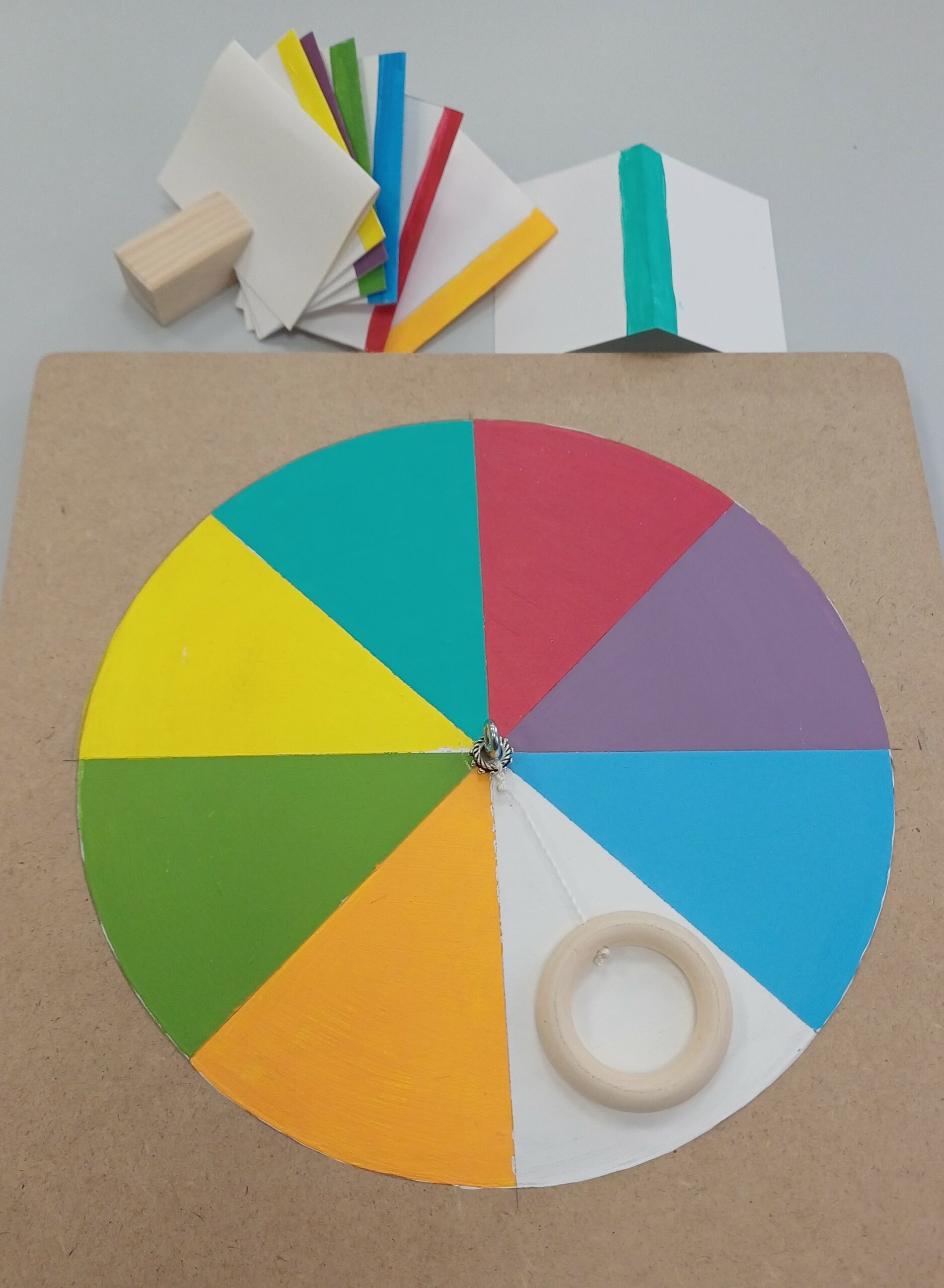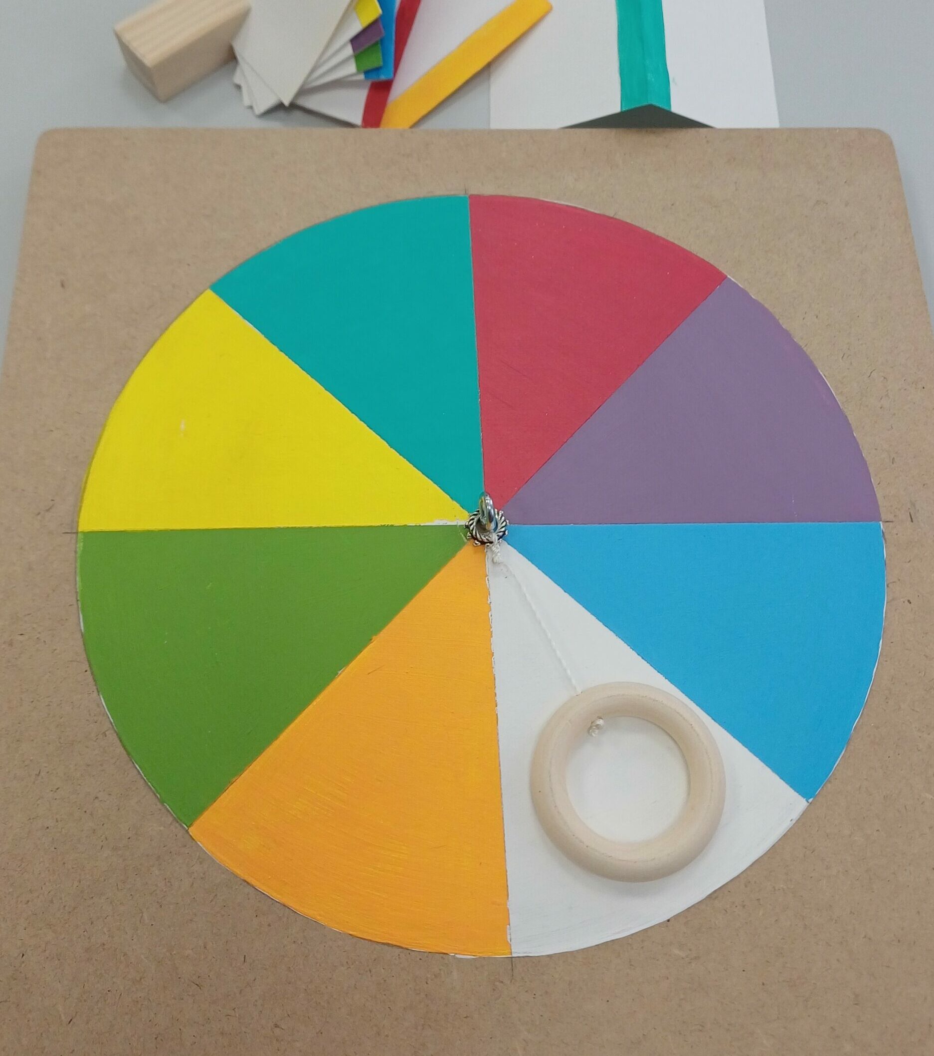 Material: Holzplatte mit Farbenkreis, farbige Aufgabenkarten, Pendel