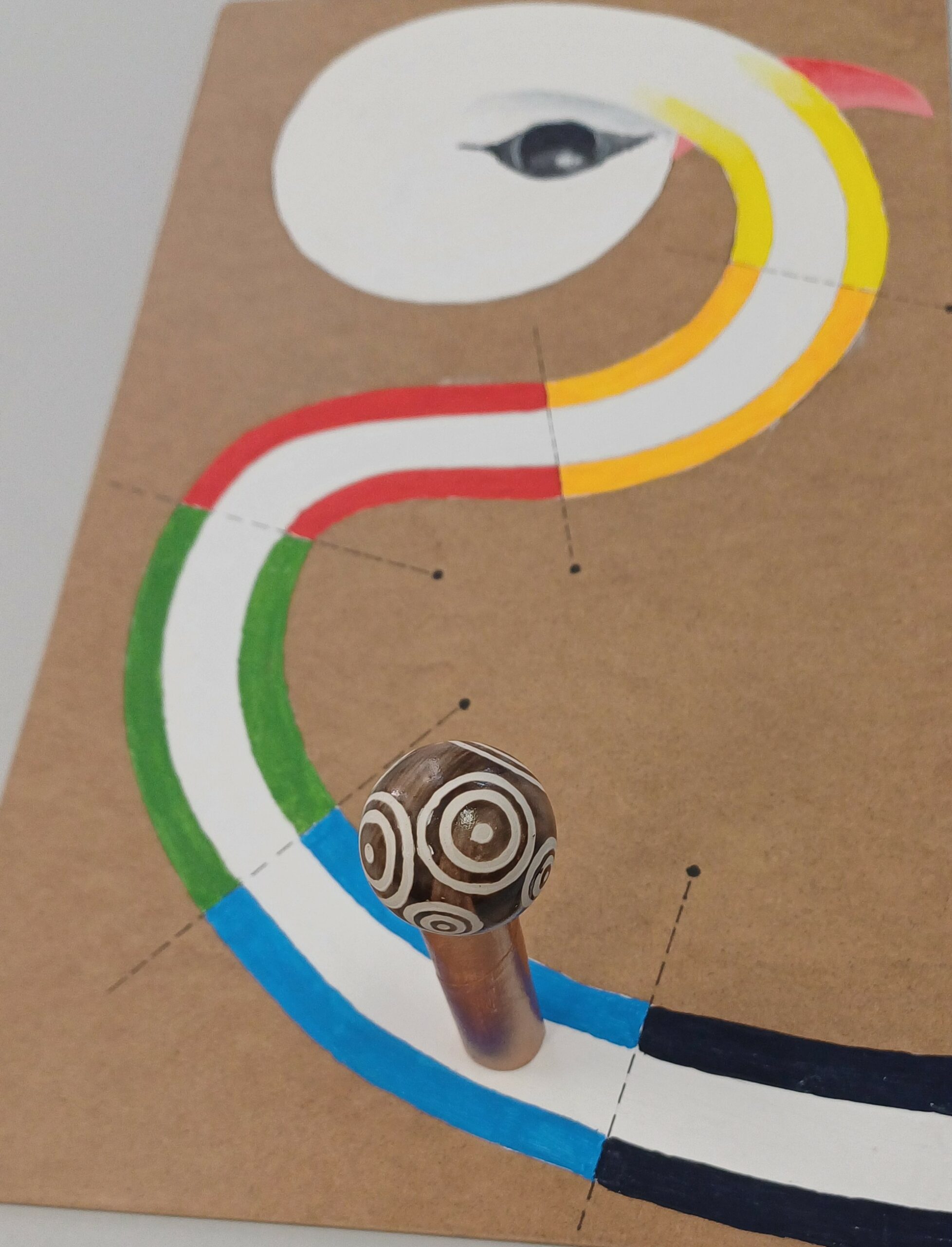 Ablauf: Die Kugel wird auf der Röhre balanciert und darf nicht herunterfallen. Auf den farbigen Feldern der Schlange werden Dinge genannt, die dieselbe Farbe haben wie das Feld. Das Spiel verläuft vorwärts bis zum Ziel und anschließend rückwärts. Dabei müssen sich die Teilnehmenden merken, was zuvor genannt wurde. Varianten sind möglich, z. B. themenbezogene Begriffe oder Ausschlussaufgaben.