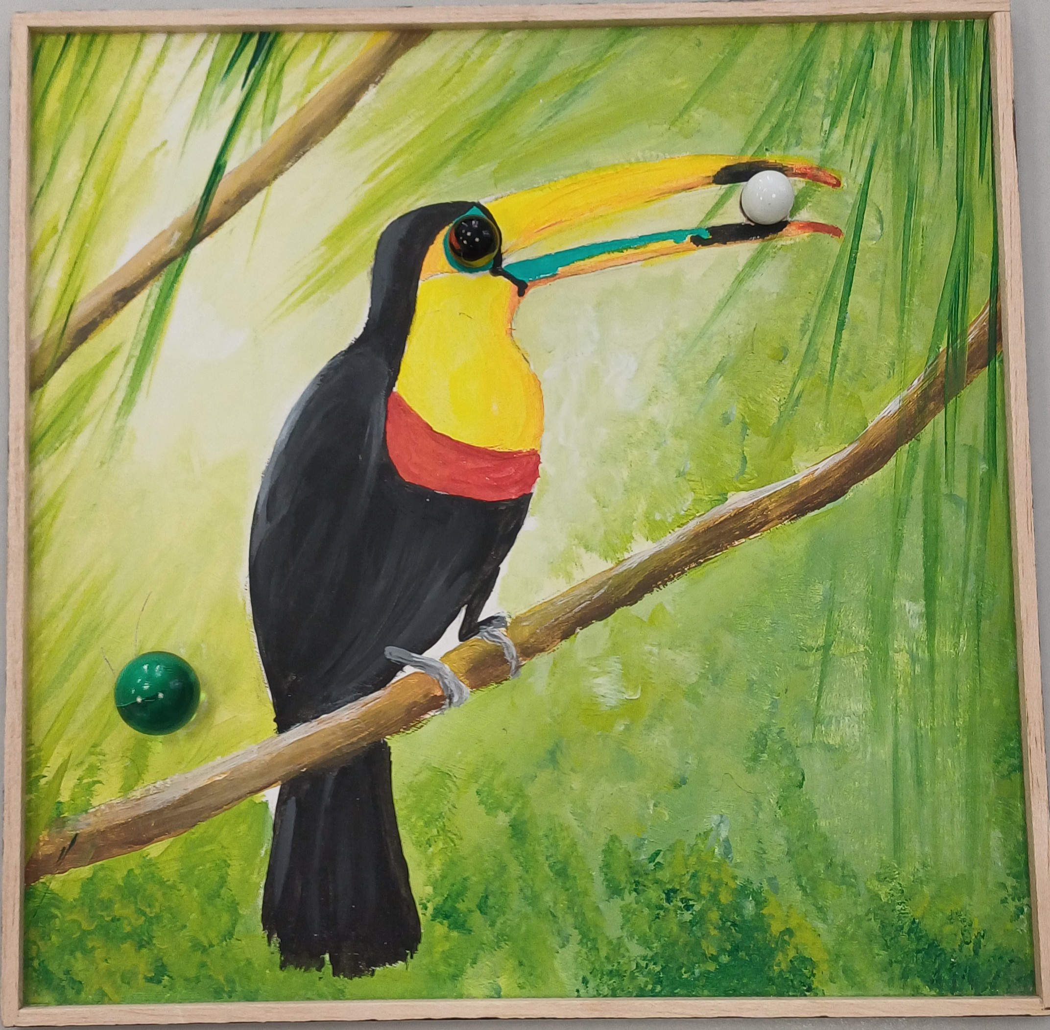 Ablauf: Die Kugeln werden entsprechend ihrer Größe den passenden Öffnungen im Bild zugeordnet – als Auge des Tukans oder als Futter im Schnabel. Dabei sind Konzentration und Feinmotorik gefragt.