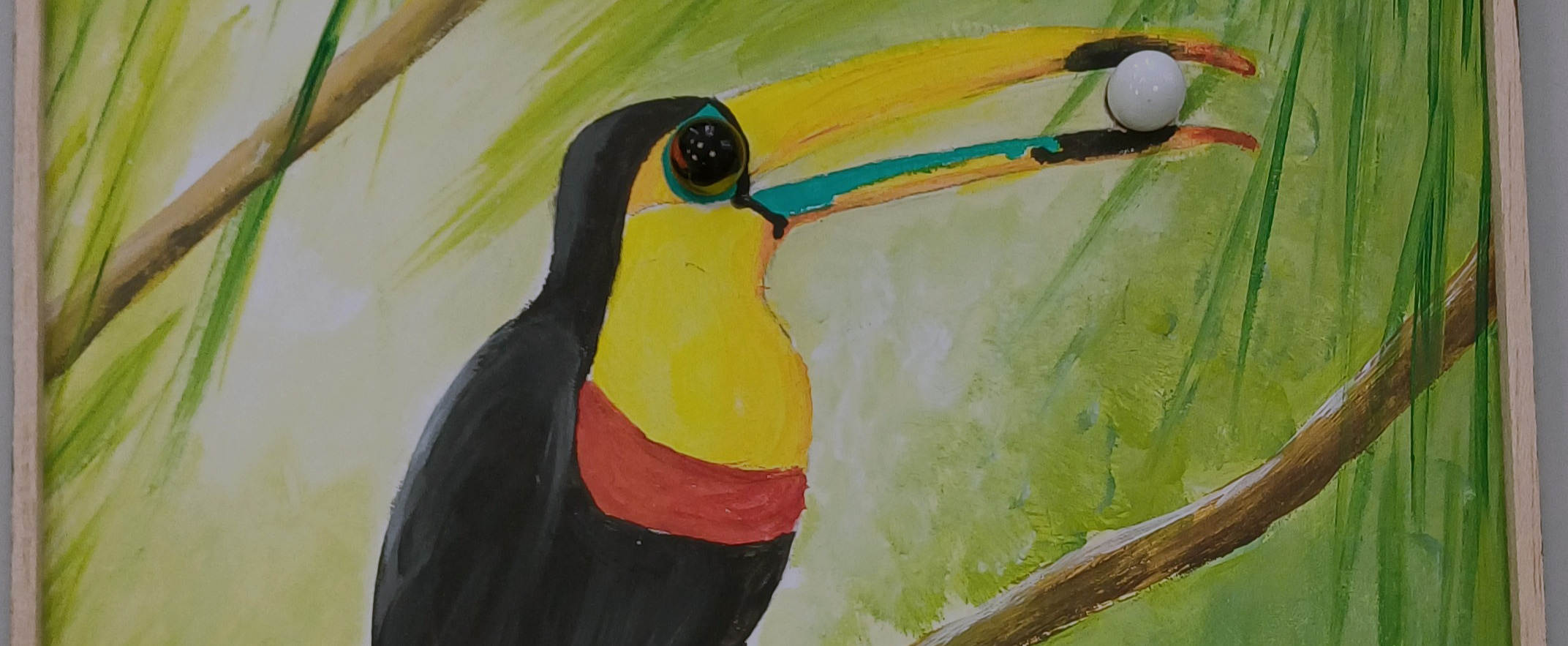 Ablauf: Die Kugeln werden entsprechend ihrer Größe den passenden Öffnungen im Bild zugeordnet – als Auge des Tukans oder als Futter im Schnabel. Dabei sind Konzentration und Feinmotorik gefragt.